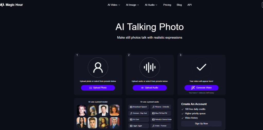 | Magic Hour | Image-to-Video Creation, Talking Photos | Image, Video, Audio | Web | Yes (Basic) | Realistic AI motion & lifelike lip-sync |